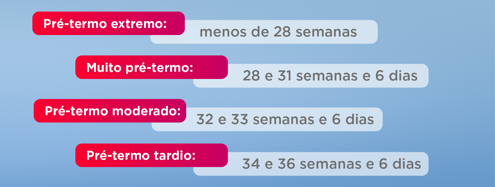 Conceitos que são cobrados no meio das questões e que devem estar na ponta da língua. Como falei anteriormente, prematuro são aqueles que nascem antes das 37 semanas de gestação. Mas, mais especificamente, pode ser classificado em diferentes categorias, dependendo da idade gestacional em que o bebê nasce: