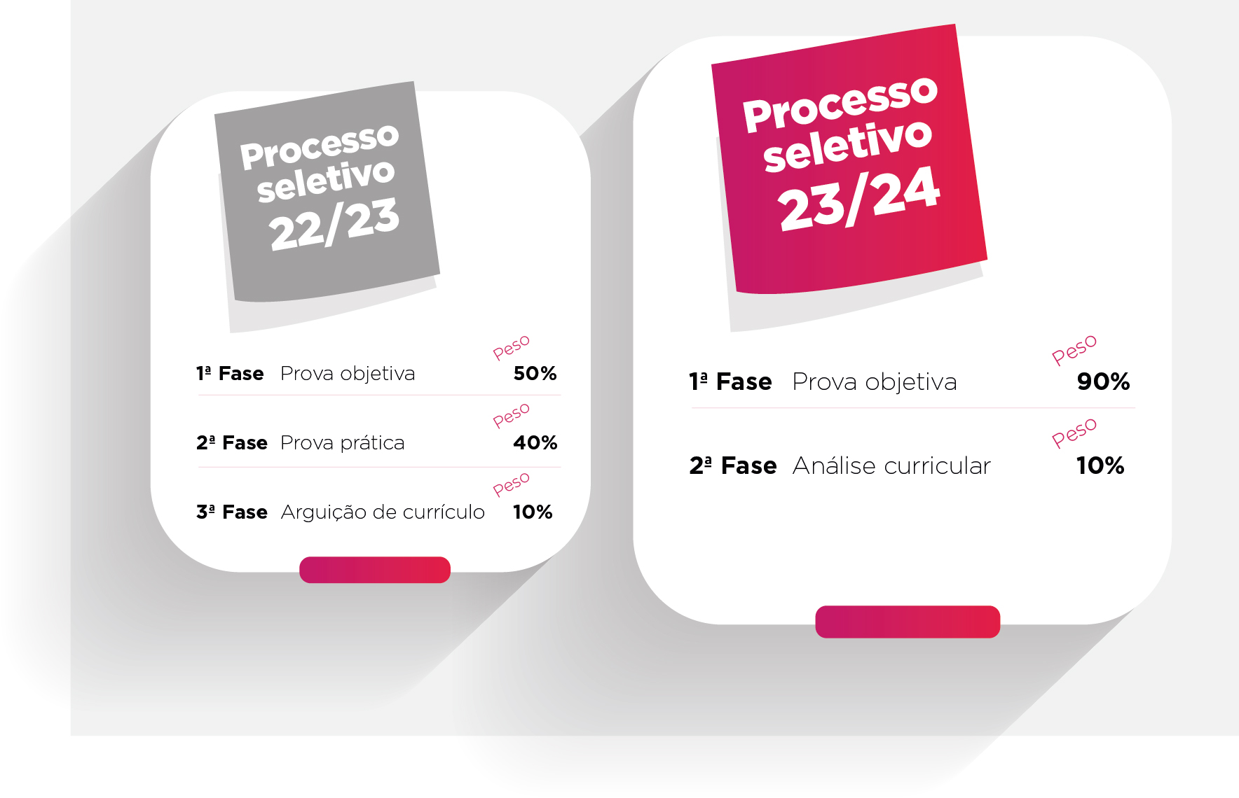Para o programa de 2024, serão apenas duas fases, compostas por uma prova objetiva, com valor de 90 pontos, e a análise curricular, valendo 10 pontos. Ou seja, a prova prática foi retirada do certame.
