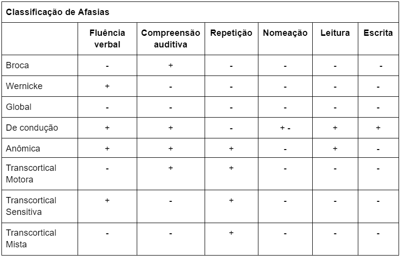 A classificação é heterogênea, visto que é resultado de uma combinação de diversos componentes característicos da linguagem, como: fluência verbal, compreensão, nomeação, repetição, leitura e escrita. Logo, sua manifestação clínica é variável, as principais síndromes de afasia estão explicitadas na tabela 1: