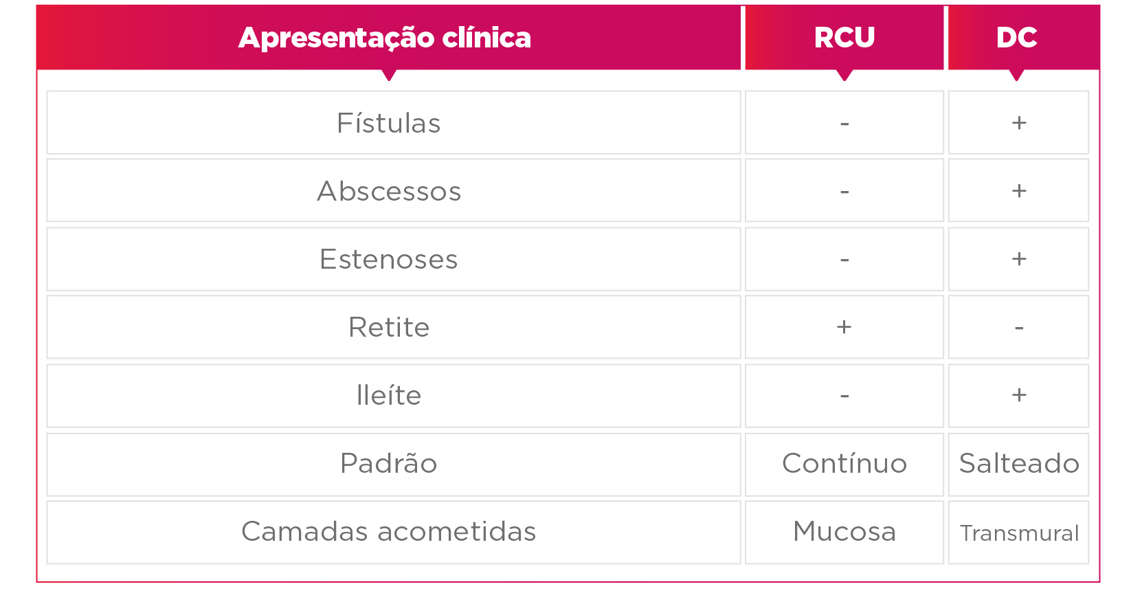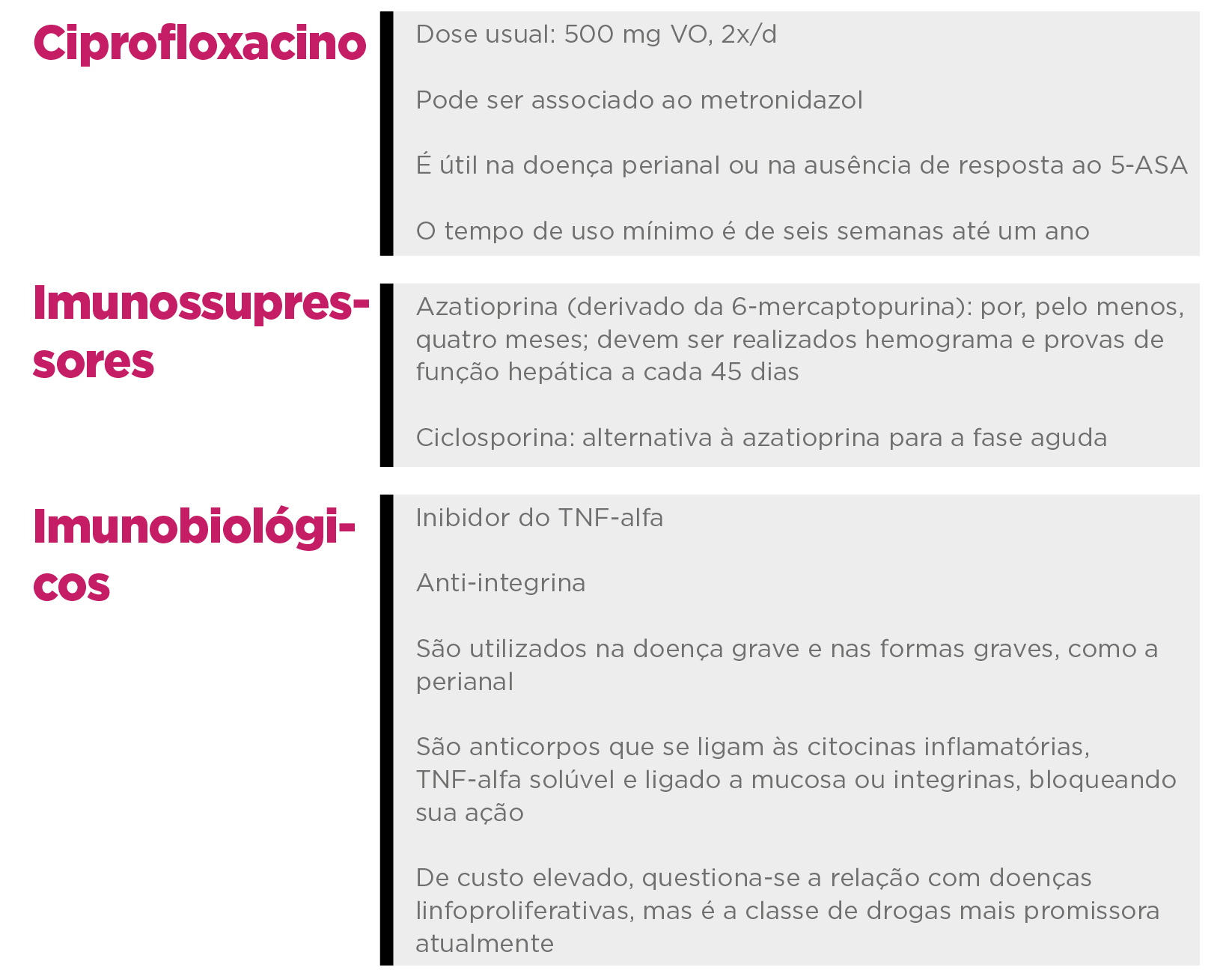 - Sintomas gastrintestinais: há períodos de crise e remissão. Os sintomas mais comuns incluem diarreia persistente, dor abdominal (geralmente no quadrante inferior direito), perda de peso, fadiga e, às vezes, sangramento retal. A gravidade dos sintomas pode variar de leve a grave, e os períodos de agravamento dos sintomas são frequentemente seguidos por períodos de remissão (menos ou nenhuma atividade da doença).