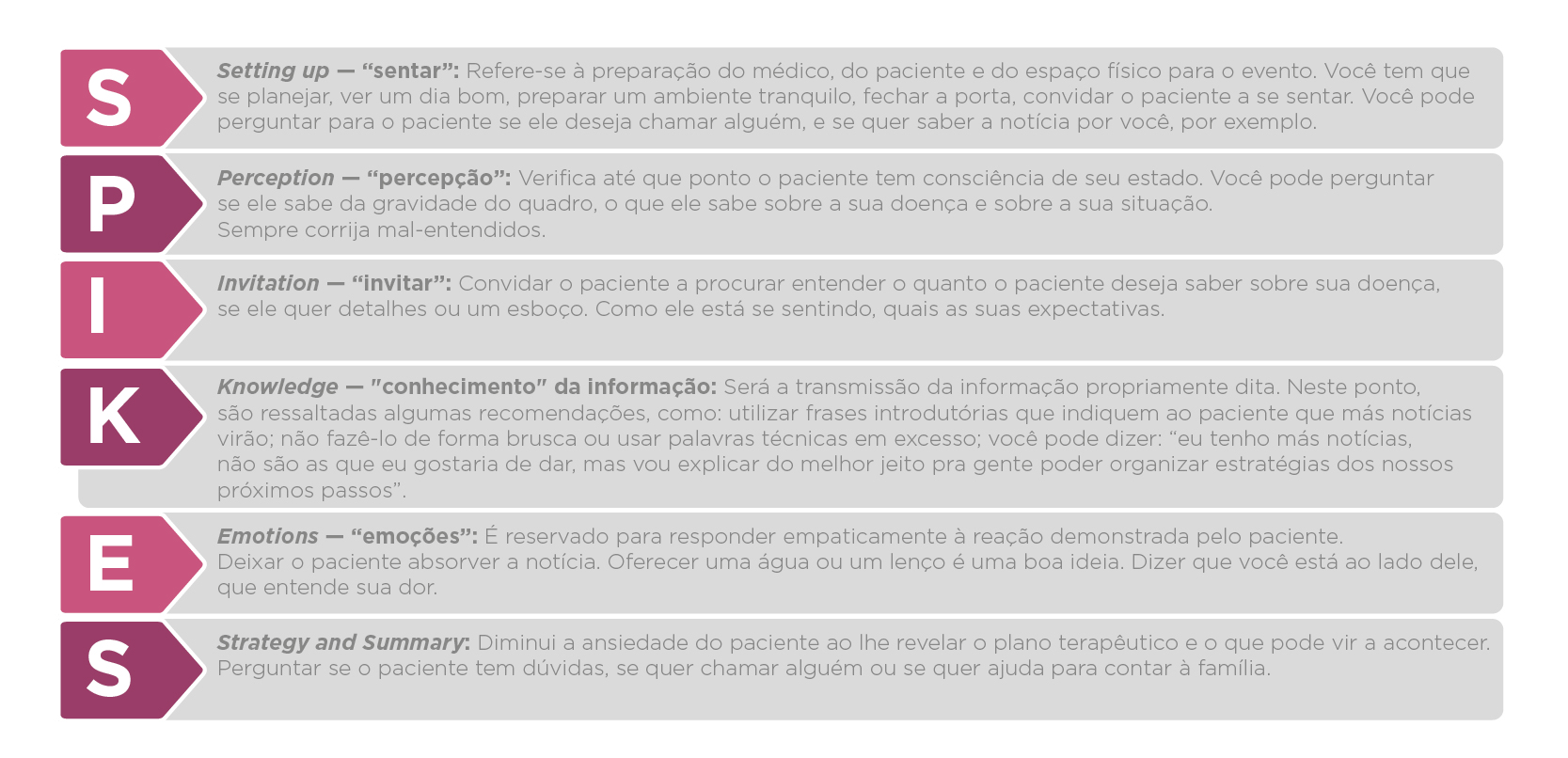 Agora, você deve estar se perguntando: o que significa esse tal de Protocolo SPIKES? Ele foi desenvolvido para ajudar a comunicar más notícias, e descreve, em seis passos, como o médico deve agir nesses momentos. Vamos lá!