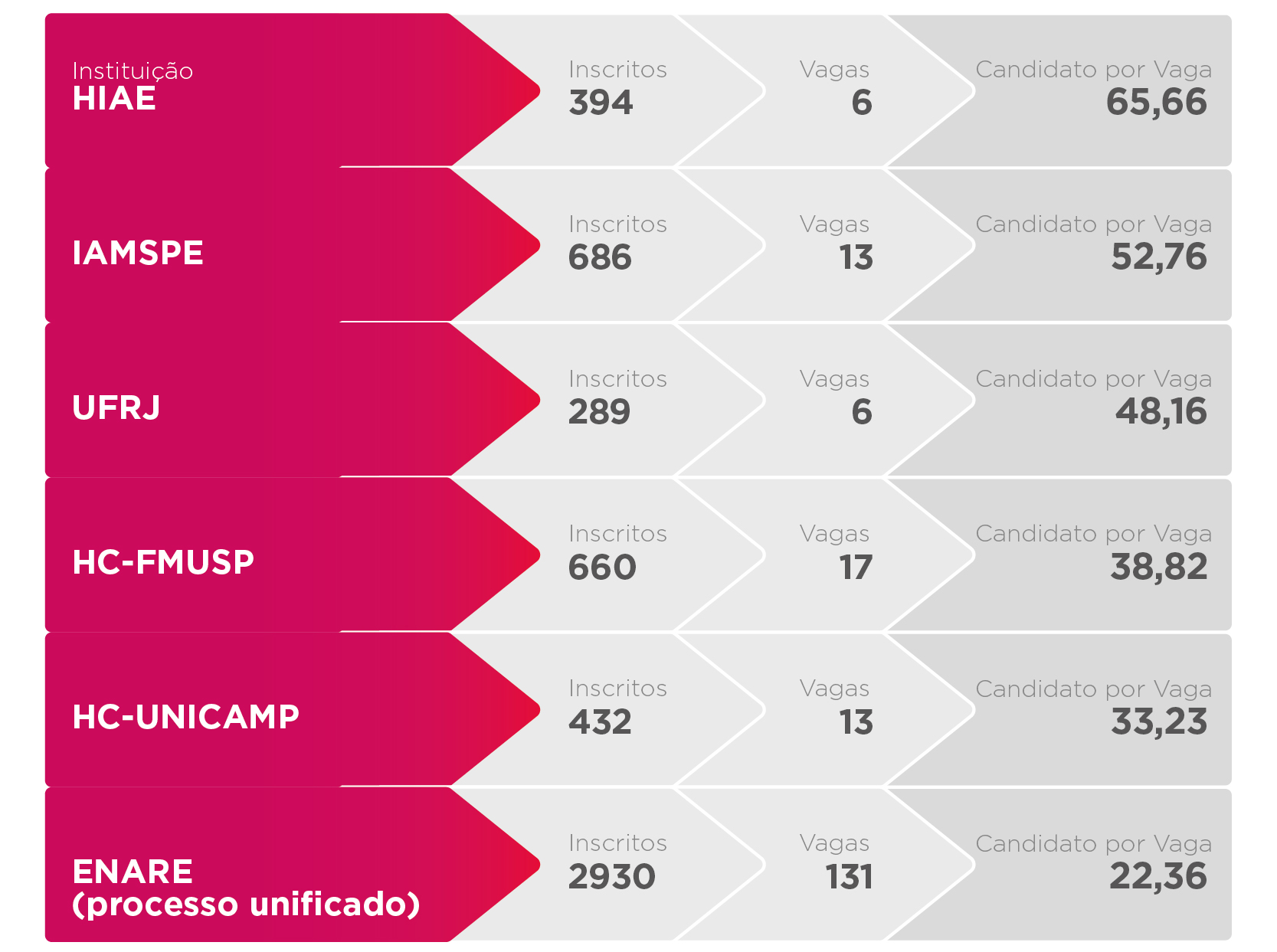 Portanto, separamos a seguir a relação candidato-vaga de alguns dos grandes processos seletivos. Aqui, ressaltamos que algumas instituições médicas possuem processo seletivo unificado, chamados de PSU, como é o caso do ENARE.