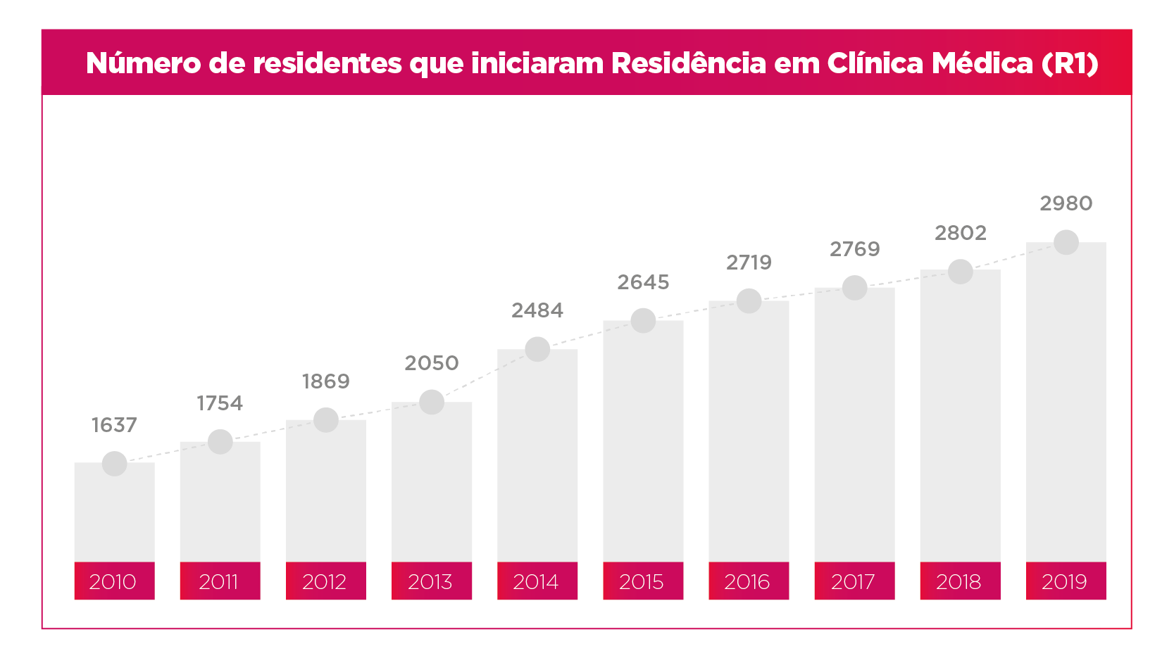 O número de resistentes em Clínica Médica teve um aumento significativo nos últimos anos. O que pode estar relacionado com o aumento da demanda por esses profissionais, com o foco crescente envolvendo a Medicina Preventiva, com o fato de ser um pré-requisito para outros programas de Residência (que seguem cada vez mais procurados), entre diversos outros fatores.