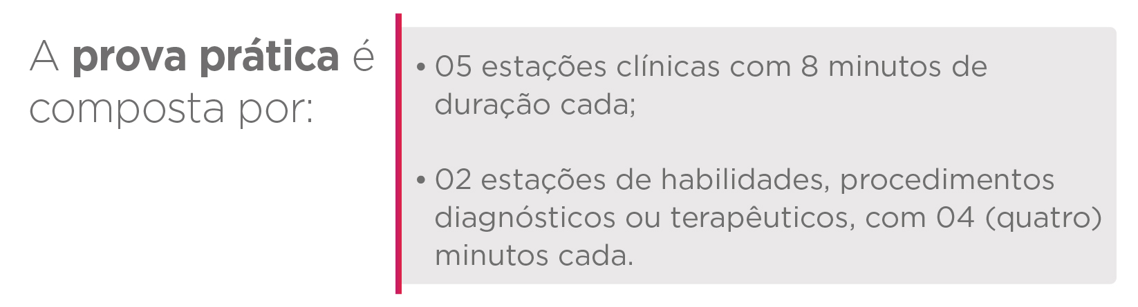 A prova prática é baseada nos conteúdos programáticos disponíveis na primeira fase. O objetivo dessa etapa é avaliar se os conteúdos são integrados a competências pessoais não cognitivas desejáveis ao médico.