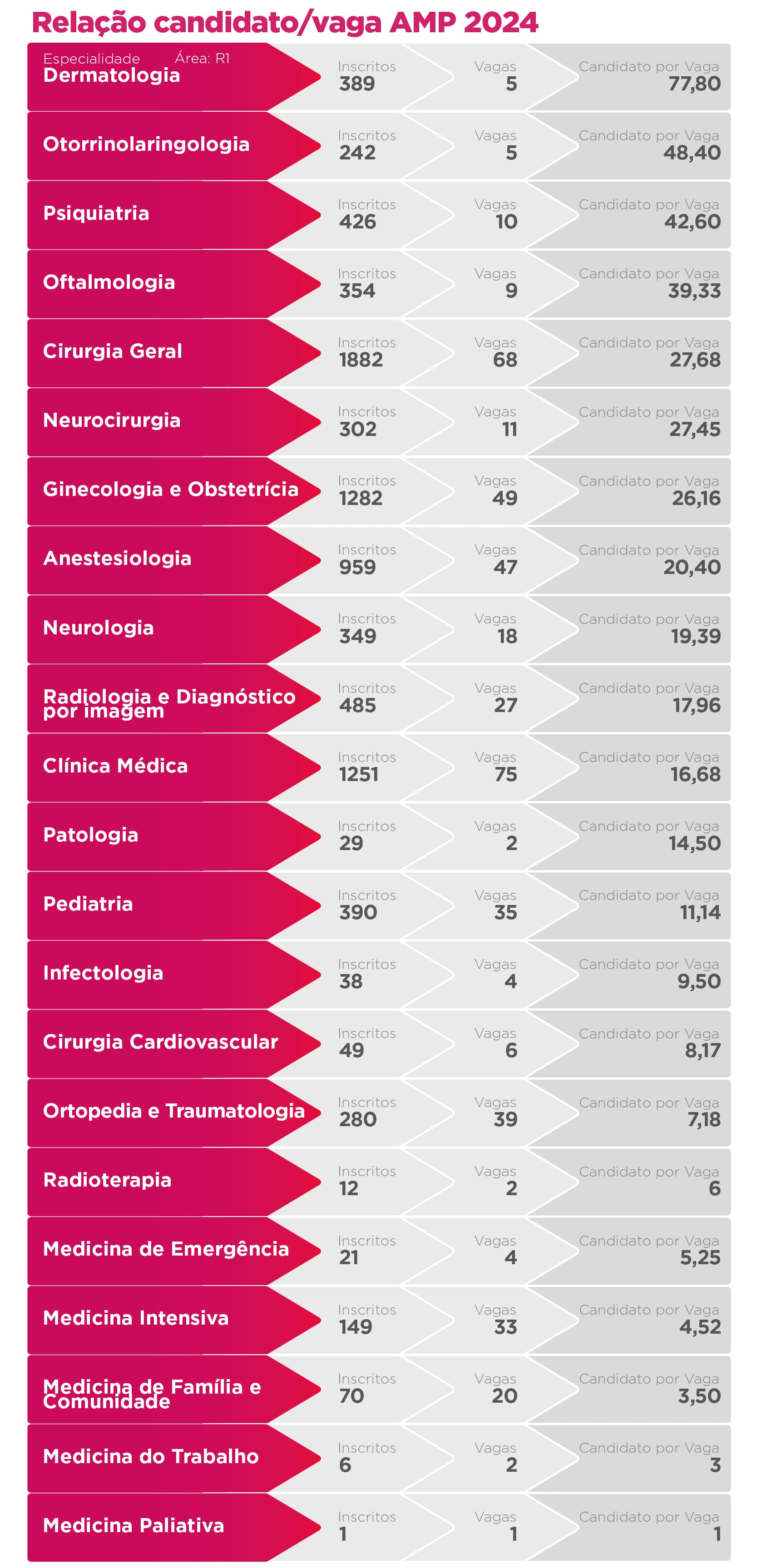 A Associação Médica do Paraná - AMP divulgou a quantidade de inscrições deferidas para participar do processo seletivo para residência médica. Confira como fica a relação candidato x vaga para cada especialidade: