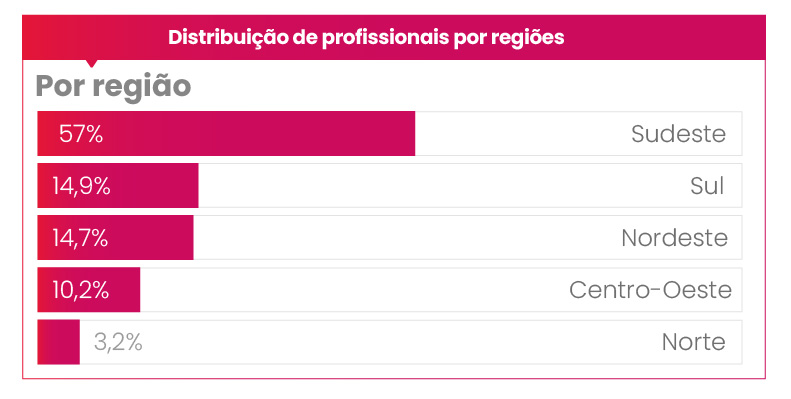 Tratando-se da distribuição geográfica, a Medicina Nuclear também tem um desequilíbrio na disposição de profissionais ao longo do território. Além da maioria se concentrar nas capitais (63,1%), a região Sudeste é a que tem o maior número de especialistas atuando. Confira abaixo: