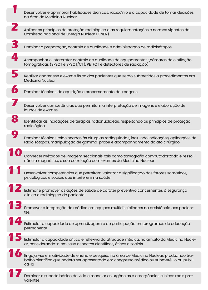 Confira abaixo os objetivos específicos do programa de acordo com Resolução nº 24, de 16 de abril de 2019, que aprova a matriz de competências dos Programas de Residência Médica em Medicina Nuclear: