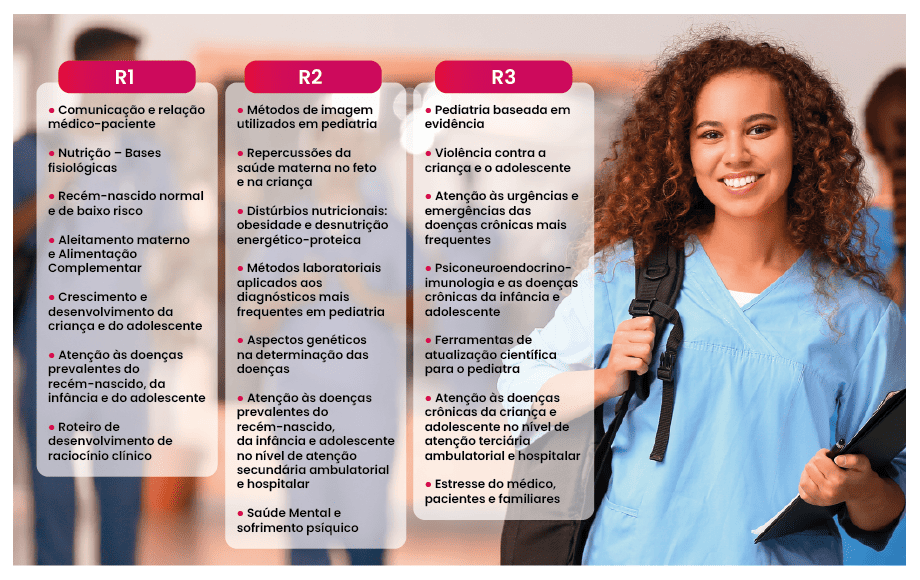 É durante esses três anos de residência que o médico generalista aprende e coloca em prática o conteúdo teórico adquirido na graduação e vivencia os principais casos da Pediatria, passando por: