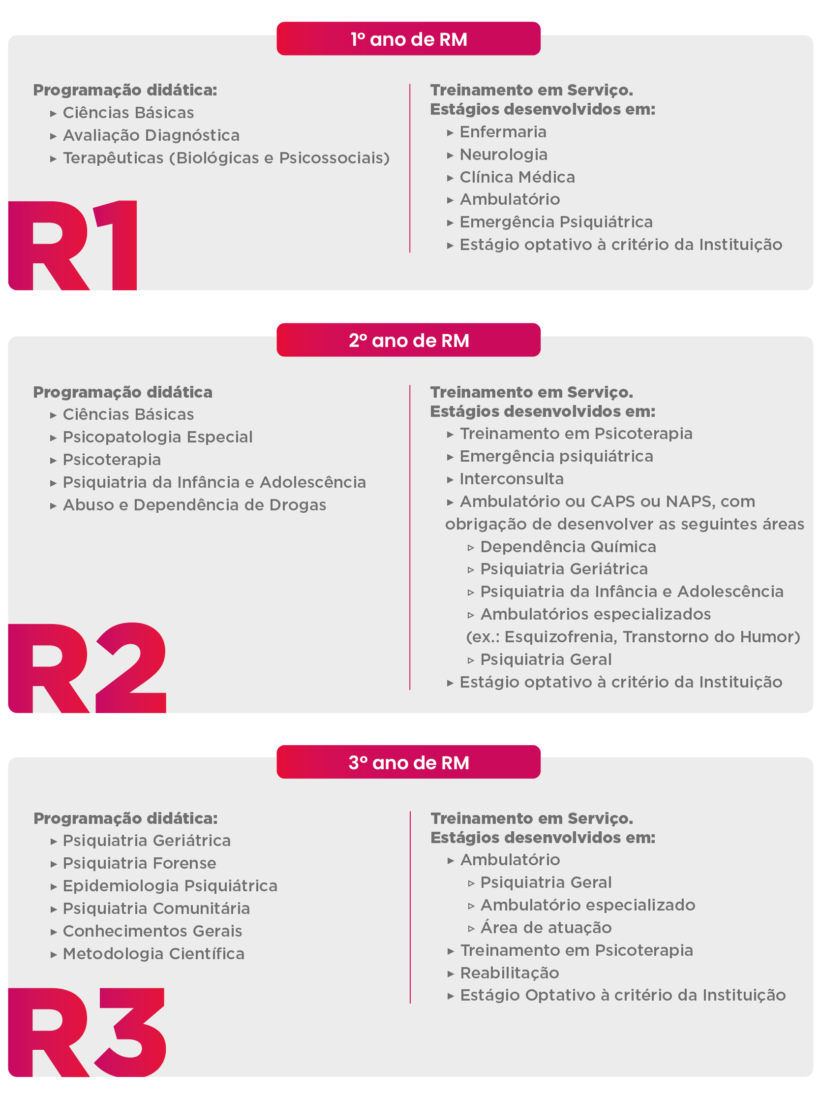 O programa de Residência Médica em Psiquiatria é de 3 anos, com carga horária de 60 horas semanais. Dê uma olhada em como são divididos esses anos de acordo com o Programa Mínimo para Residência Médica em Psiquiatria da ABP: