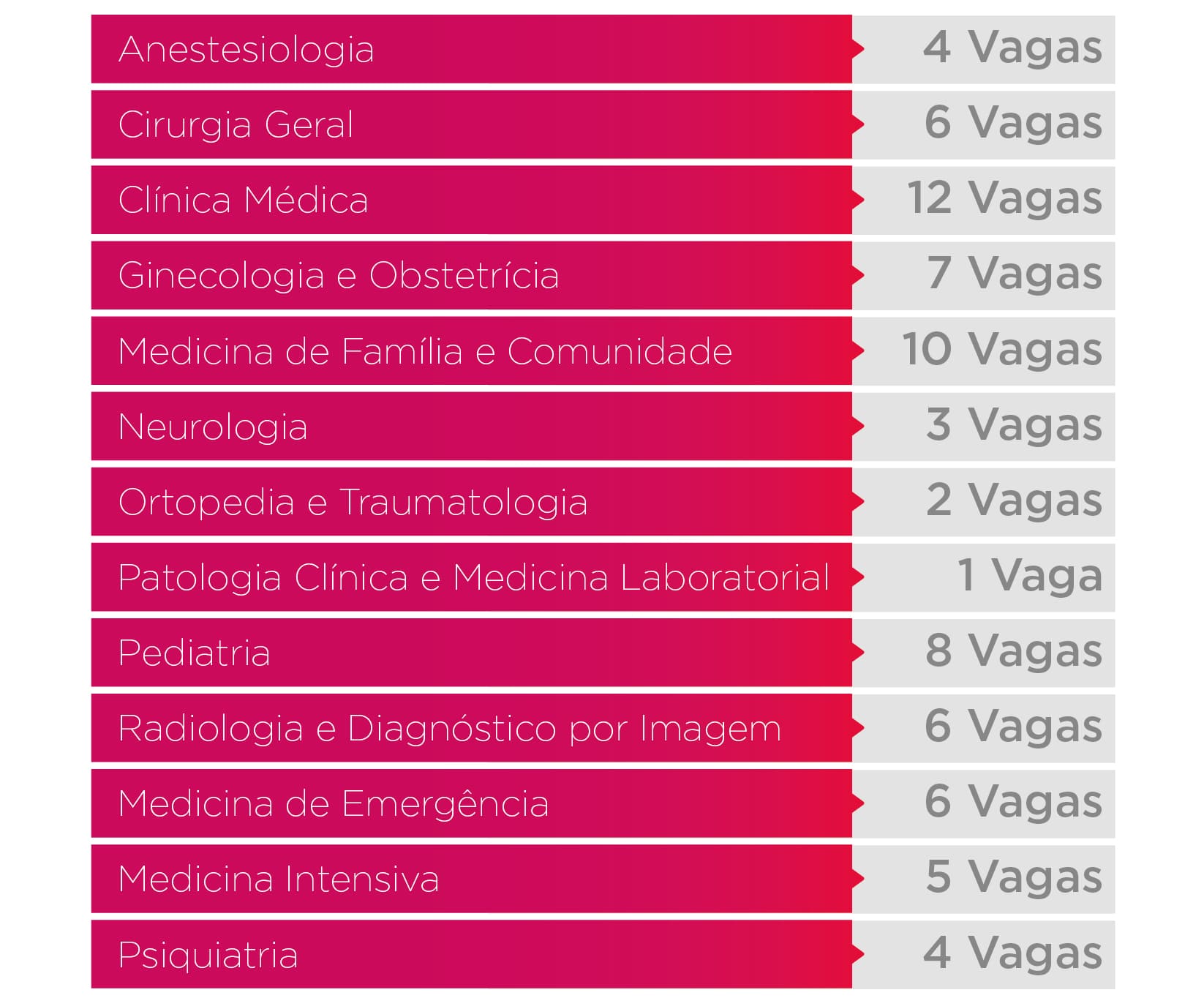 Segundo o edital, são 74 vagas para entrada direta divididas em 13 especialidades conforme o quadro abaixo: