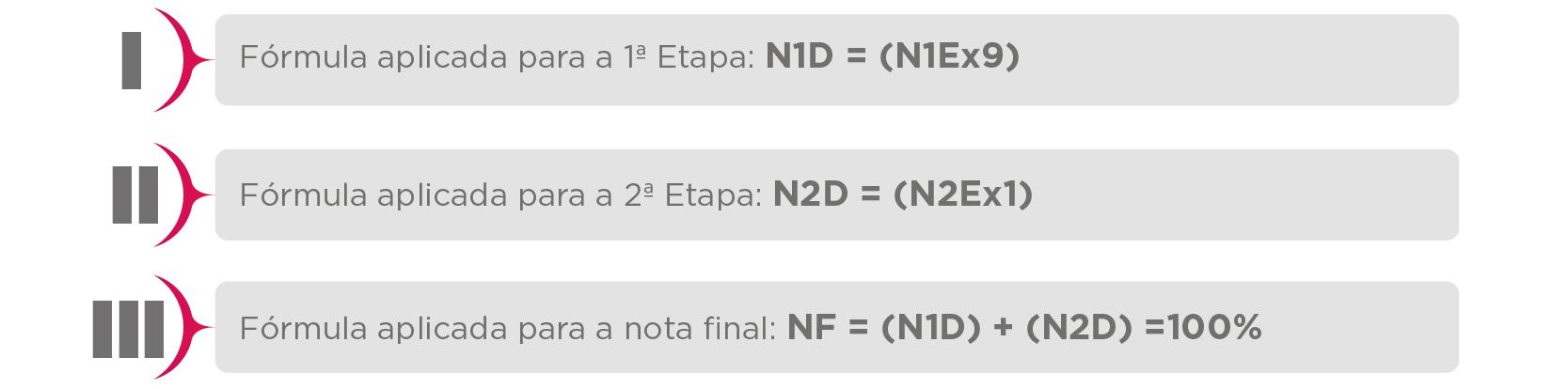 Cada etapa do processo vale um total de 100 pontos, com variação de peso. A prova objetiva (1ª etapa) tem peso 0,9, enquanto a análise curricular tem peso 0,1. O cálculo da nota final é feito conforme a fórmula abaixo: