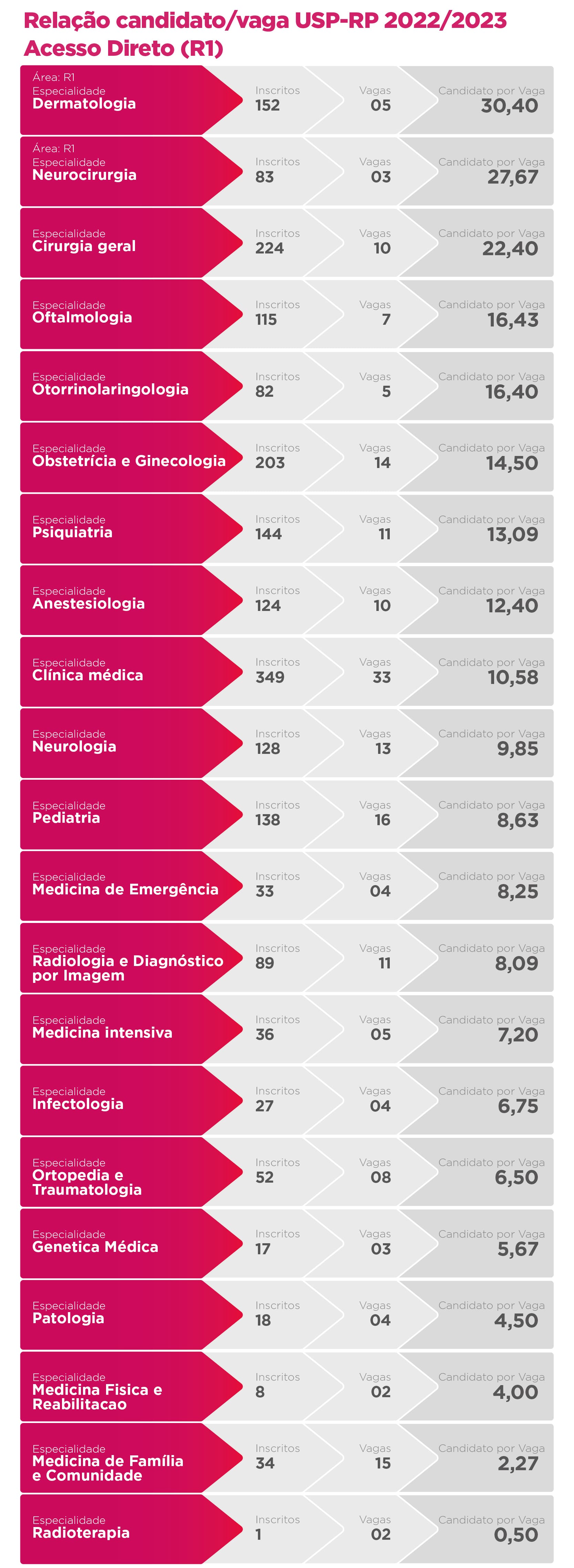 Separamos a seguir, a lista das especialidades mais e menos concorridas de acesso direto da USP-RP 2023. para te ajudar na escolha da sua área de atuação: