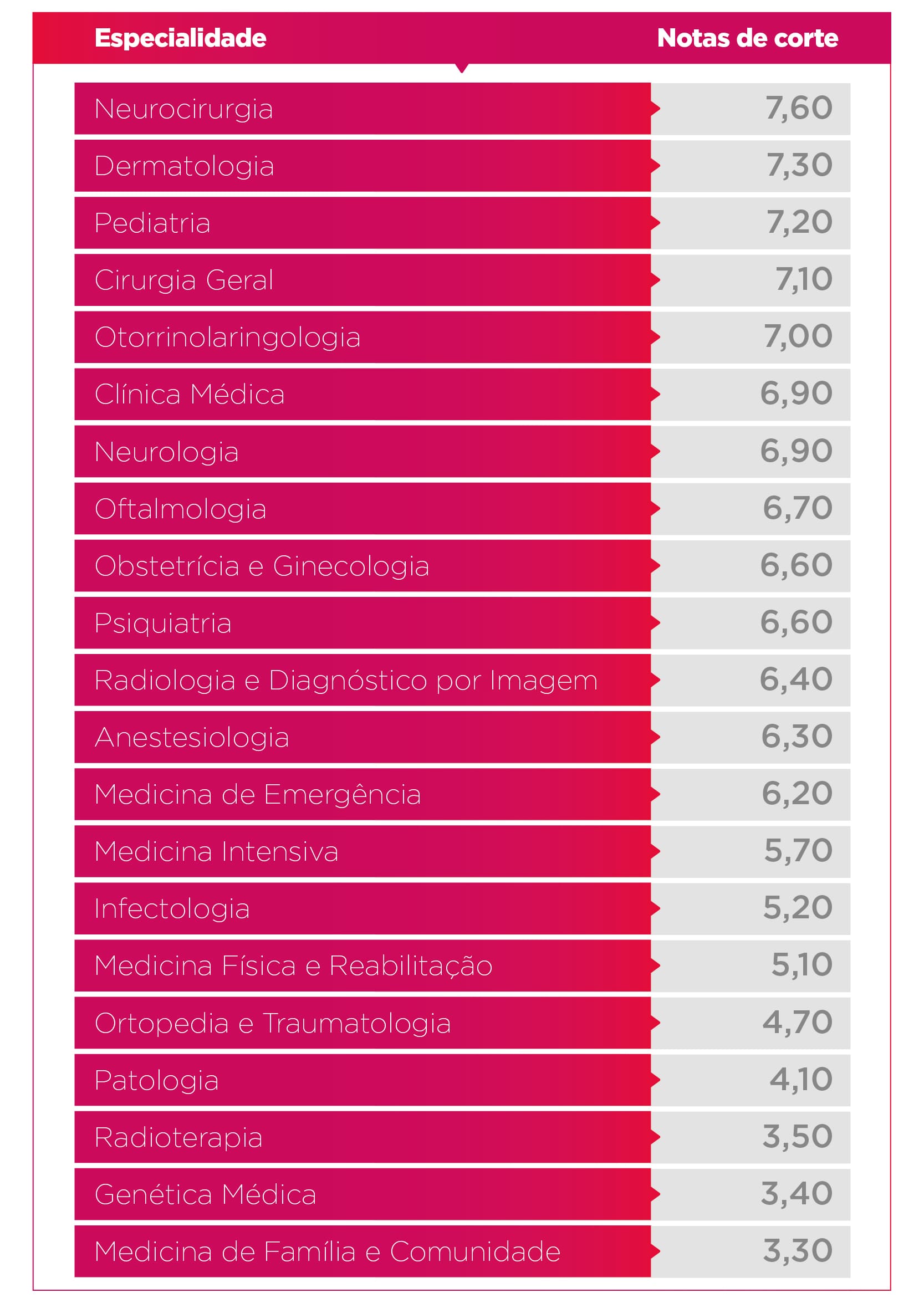 As especialidades de Pediatria e Genética Médica apresentaram variações significativas nas notas de corte em comparação a 2022. Pediatria teve um aumento de 1,3, enquanto Genética Médica registrou uma redução de 1,1.