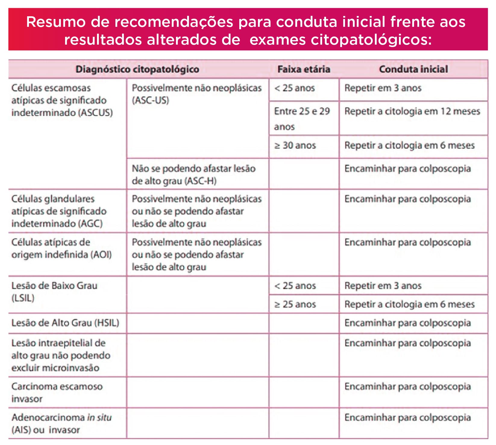 Resumo de recomendações para conduta inicial frente aos resultados alterados de exames citopatológicos: