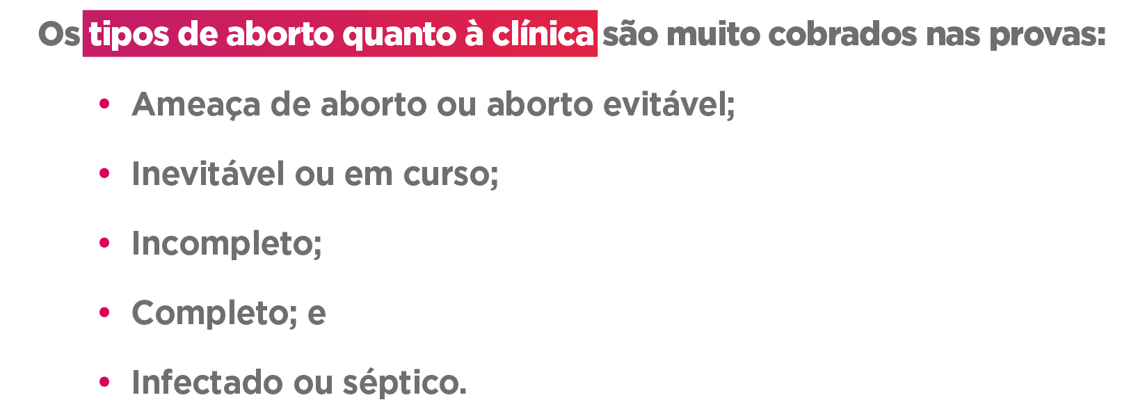 Aborto incompleto: quando há expulsão do concepto, porém a placenta ou restos placentários permanecem. Há sangramento vaginal, cólicas, colo dilatado, restos ovulares no canal vaginal ou não e útero menor que o esperado para a IG.