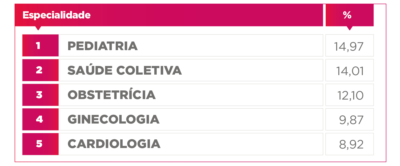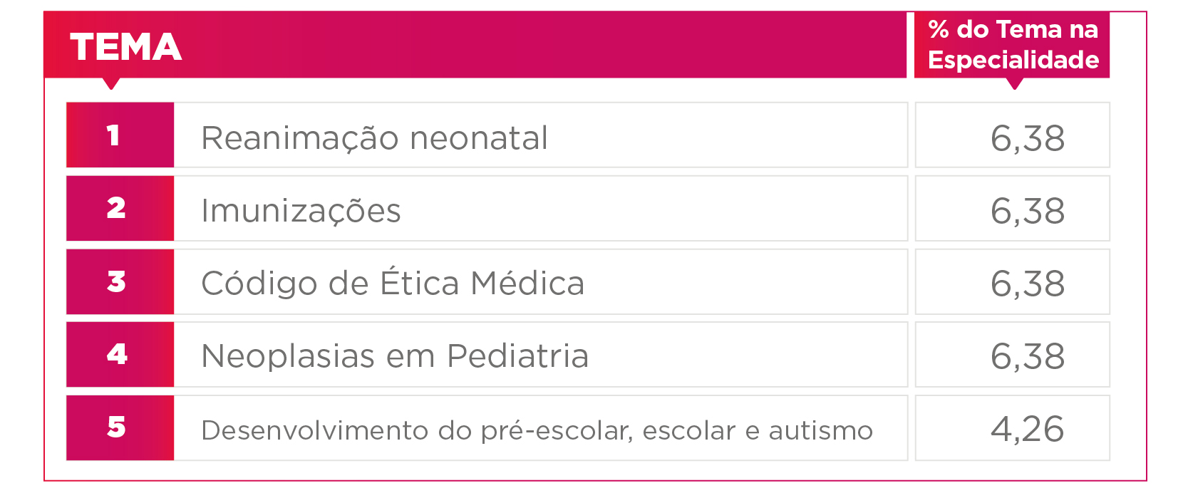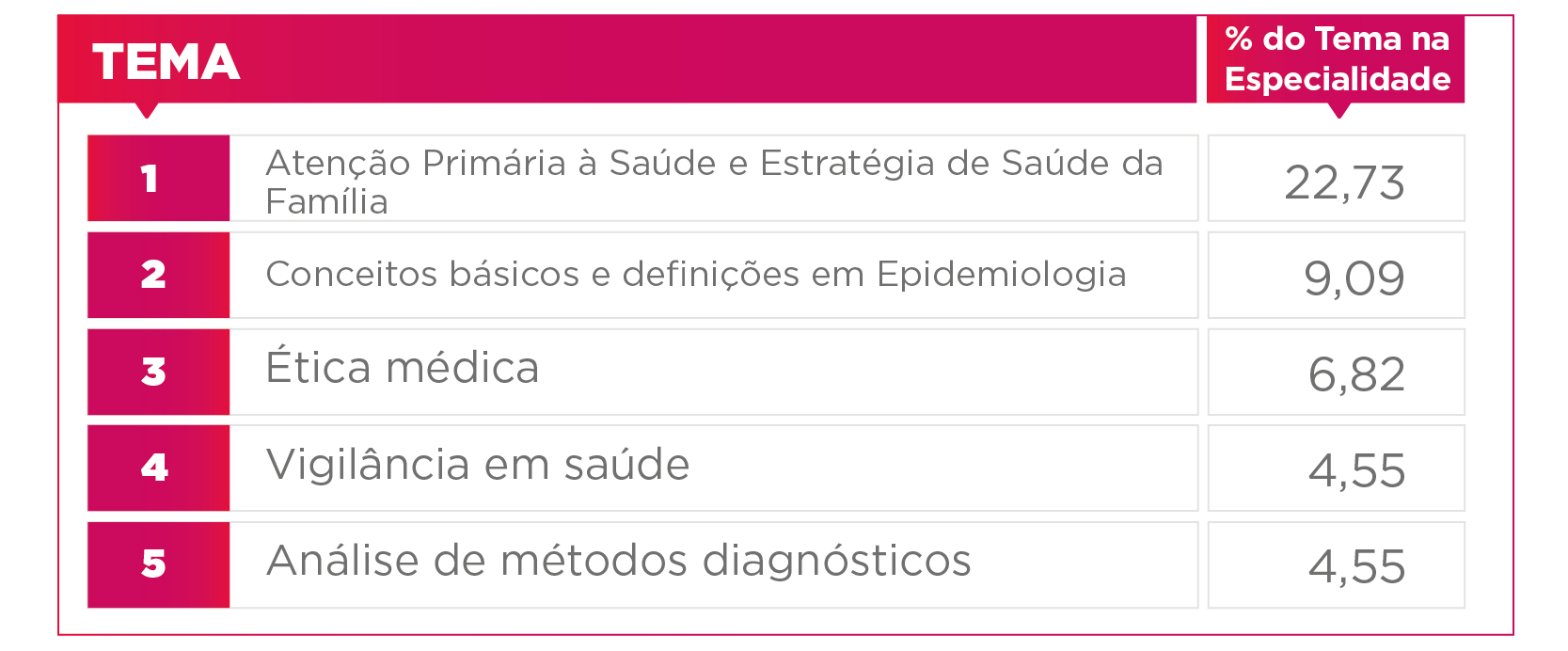A especialidade que detém o maior percentual das últimas provas é a Pediatria. Na sequência, estão Medicina Preventiva e Social (ou Saúde Coletiva), Obstetrícia, Ginecologia e Cardiologia.