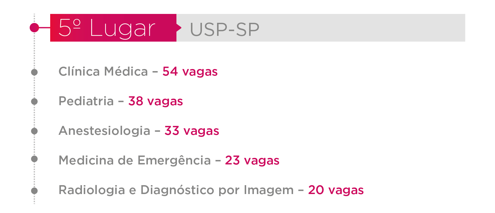 Em 2022, foram oferecidas 355 vagas para o Programa de Residência Médica da USP-SP 2023, incluindo as vagas reservadas às forças armadas. As especialidades em destaque com mais bolsas são: