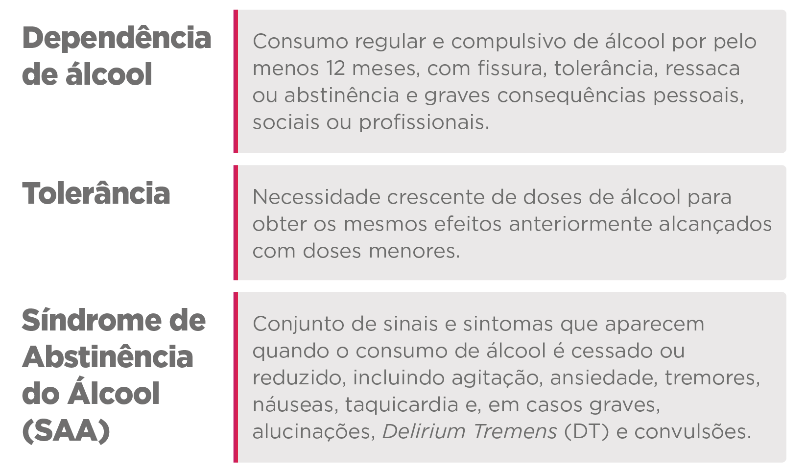 Na CID-10, os diagnósticos relacionados são uso nocivo e dependência de álcool. O DSM-5® unificou esses diagnósticos sob o termo Transtorno por Uso de Álcool (TUA), que pode ser classificado como leve (uso nocivo), moderado ou grave (dependência), de acordo com o número de critérios atendidos.