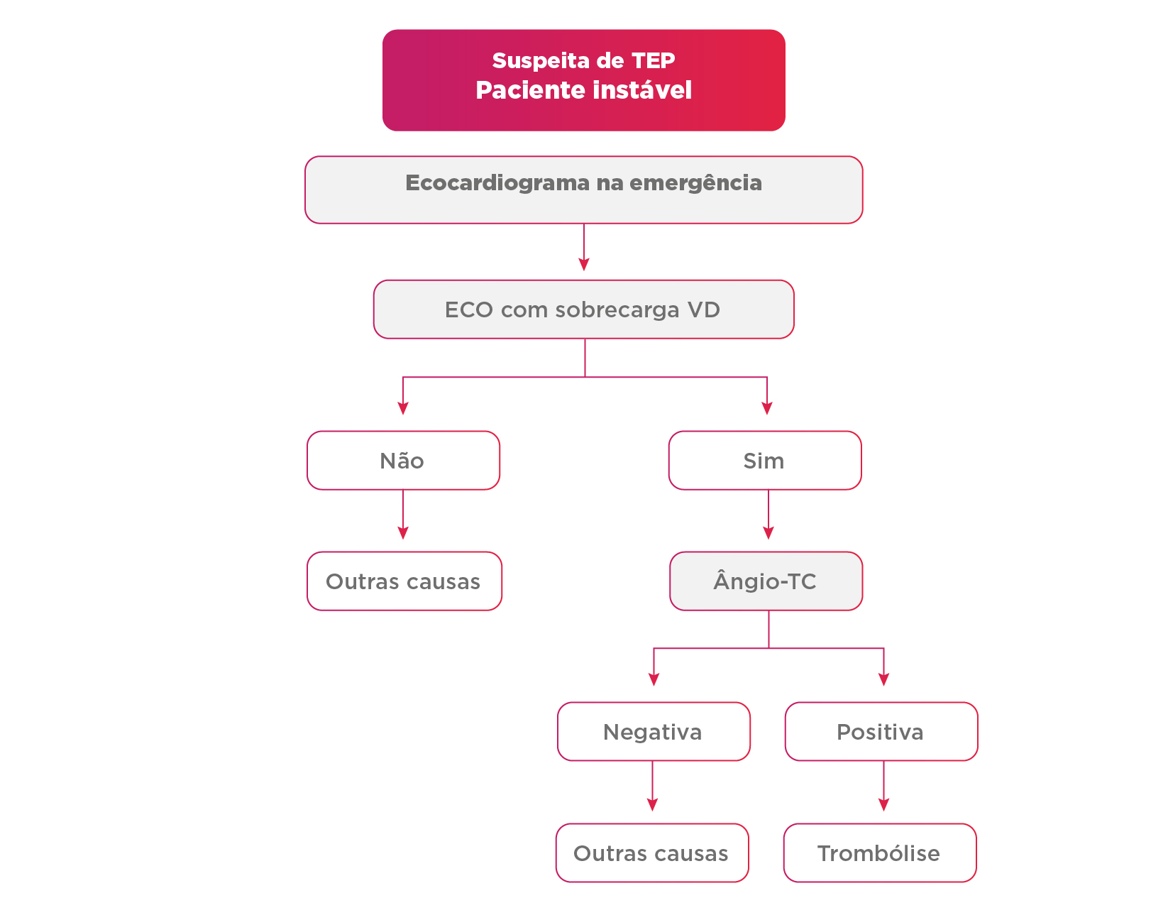 Nos de risco alto há indicação de trombólise com janela terapêutica de 14 dias. O trombolítico de escolha é o ativador de plasminogênio tecidual (rt-PA). O filtro da veia cava pode ser utilizado em pacientes com contraindicações aos fármacos e TEP de repetição.