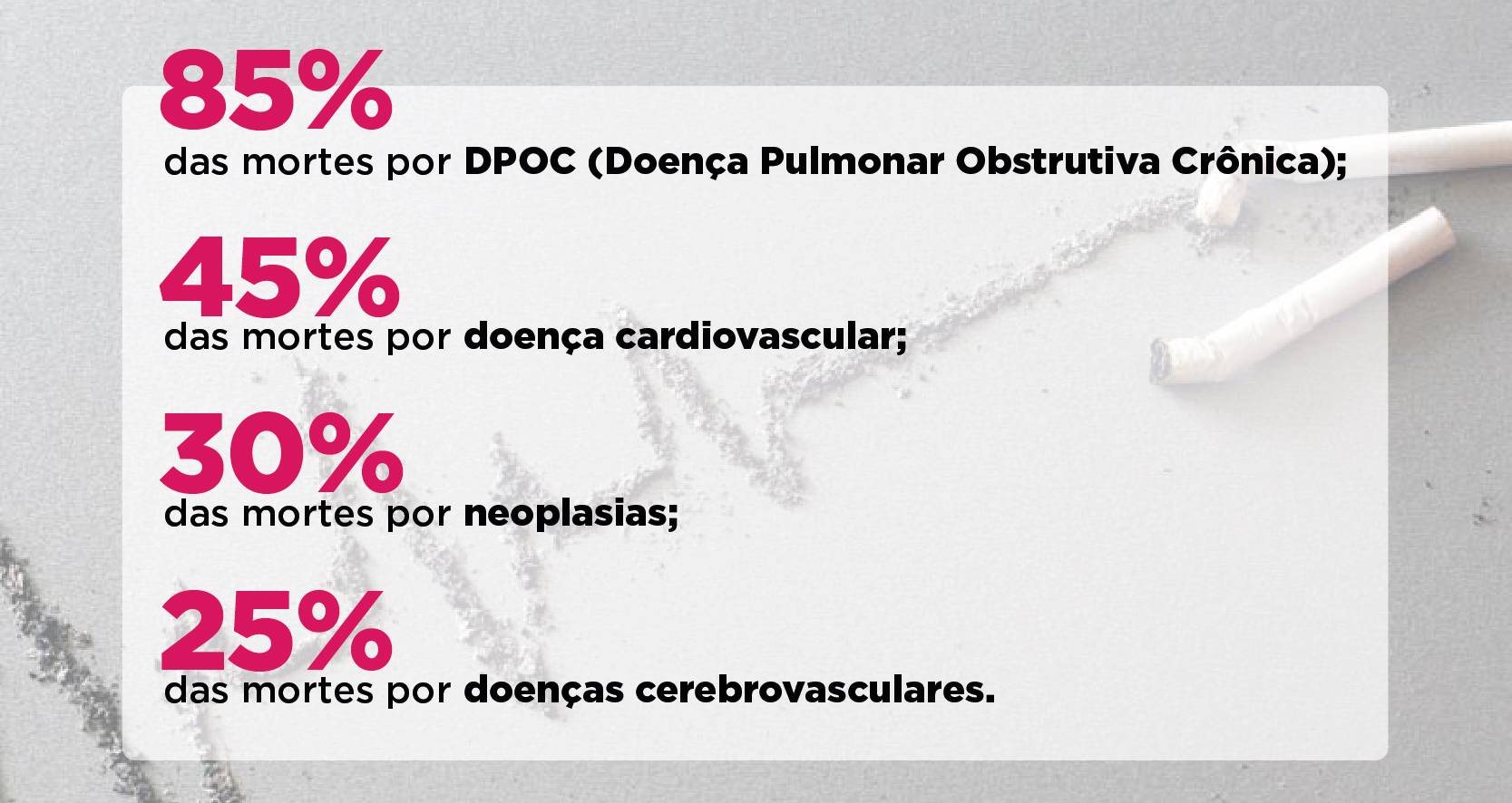 Um dado interessante é que de 15 a 25% dos tabagistas irão desenvolver DPOC, e 80% ou mais dos casos de DPOC estão intimamente ligados ao tabagismo. Lembrando que a DPOC é uma combinação de duas doenças primárias: bronquite crônica e enfisema pulmonar.