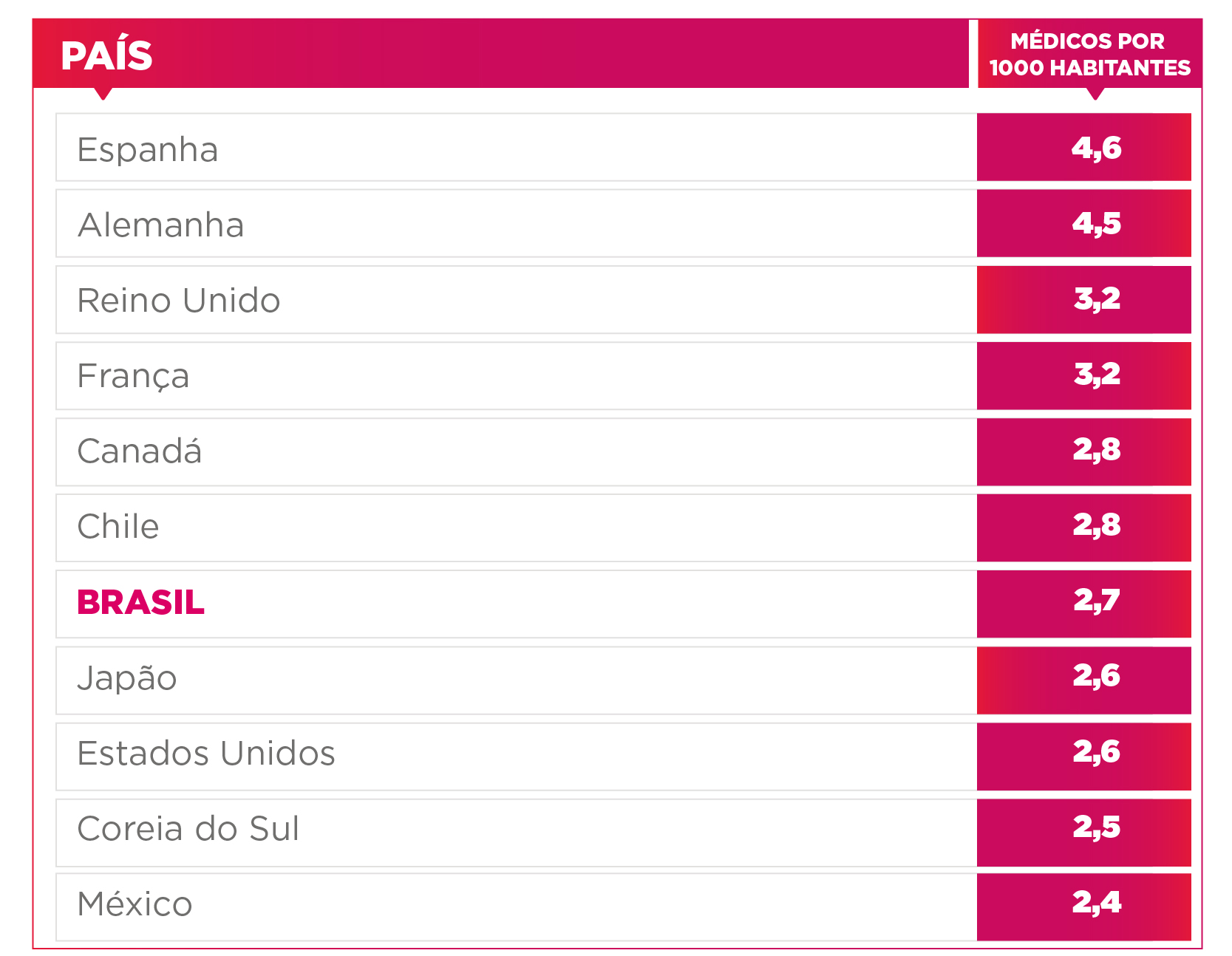 Com uma taxa de 2,69 médicos por 1.000 habitantes, o Brasil se encontra com uma densidade médica próxima a de países como Estados Unidos, Japão, Canadá e Chile. Além disso, o levantamento mostra o país acima de Coreia do Sul e México.
