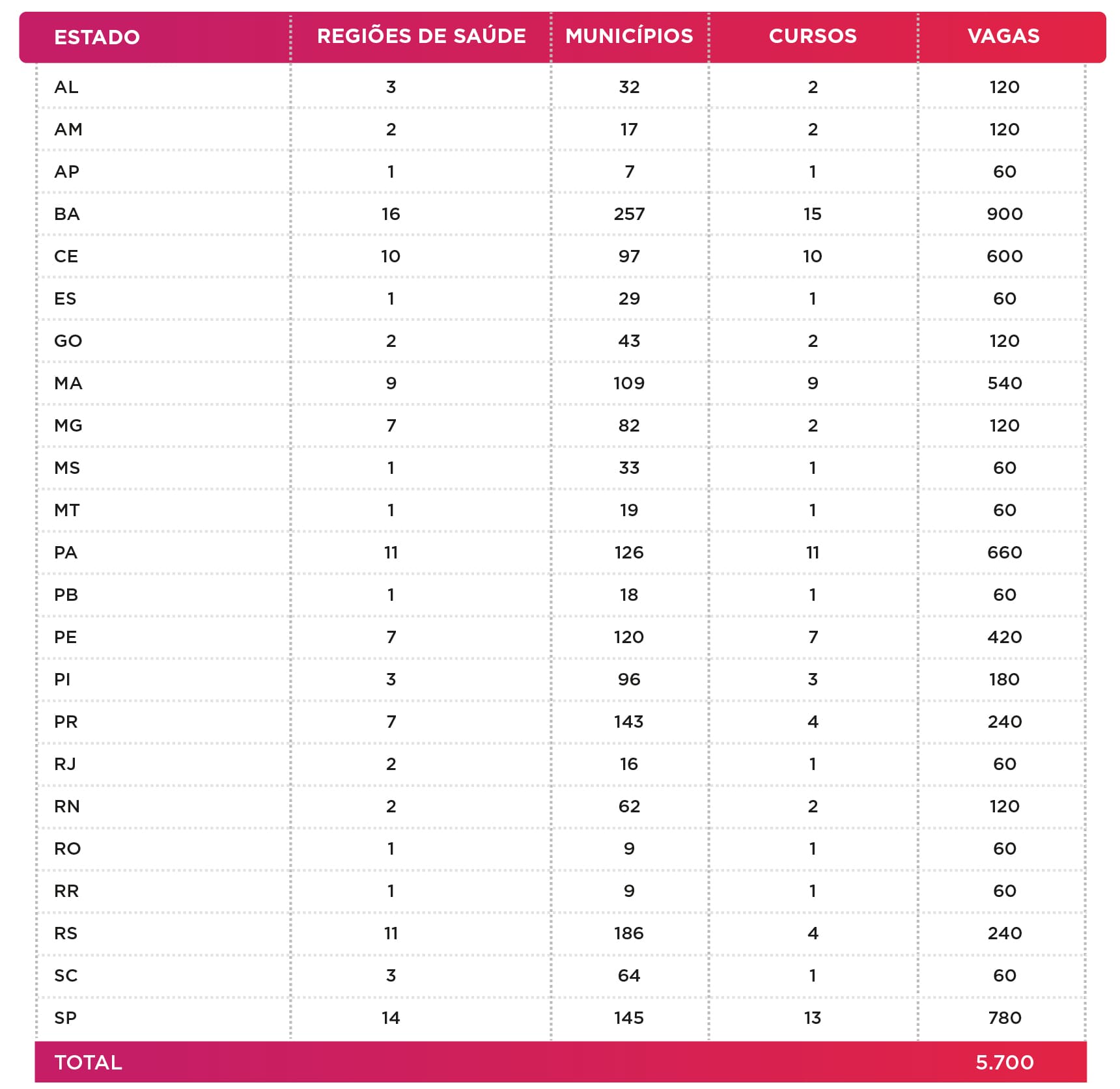 No total, o edital tem potencial para abertura de 5.700 vagas, que serão distribuídas pelos estados da seguinte forma: