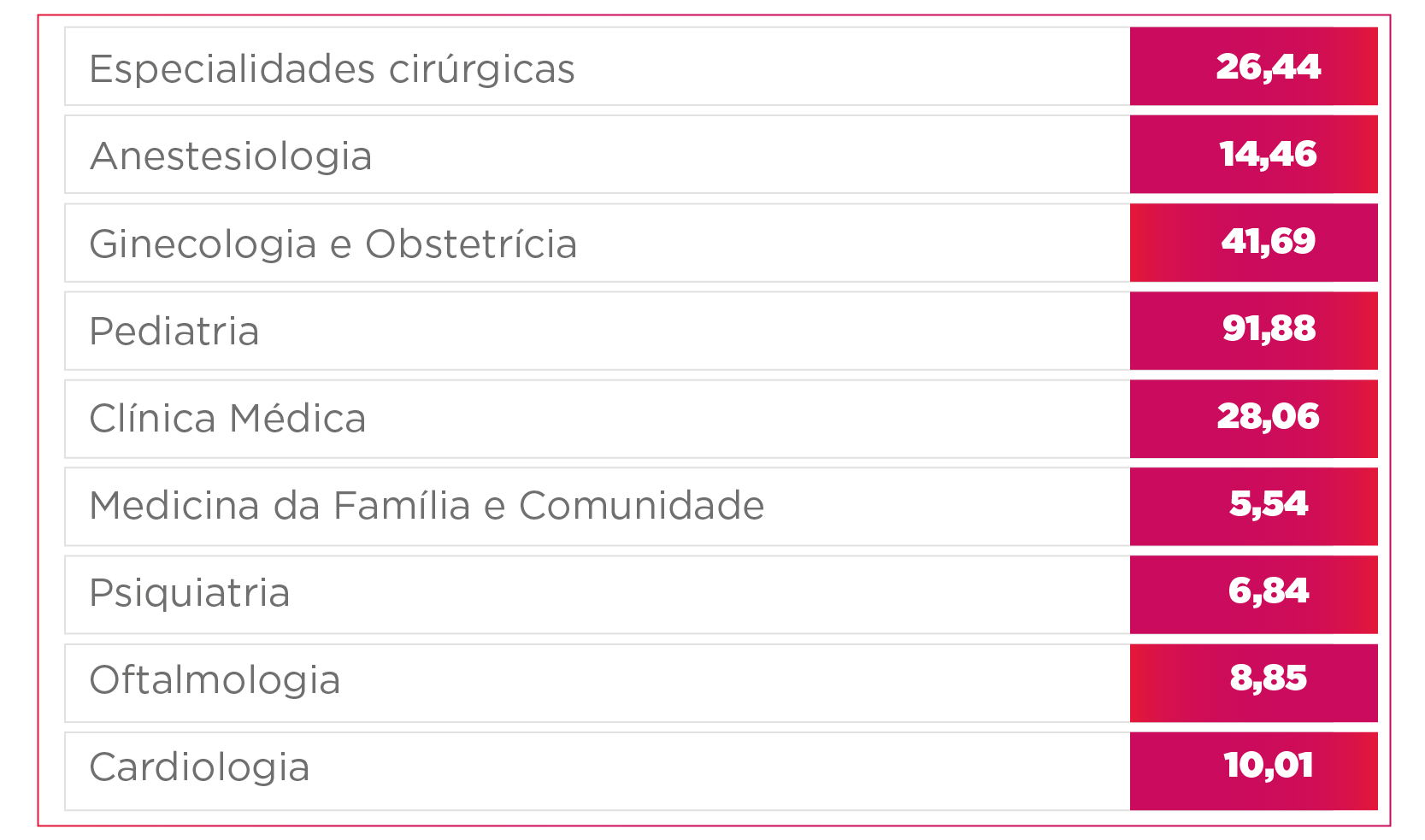 Do outro lado do ranking está Medicina da Família e Comunidade, que conta com 5,54 médicos para cada 100 mil habitantes.