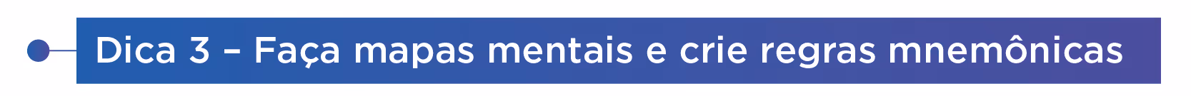 Após estudar, faça um resumo apenas com palavras-chaves e use setas, cores, entre outros recursos visuais. Regras mnemônicas também são excelentes e facilitam a memorização do conteúdo, conforme exemplo a seguir: