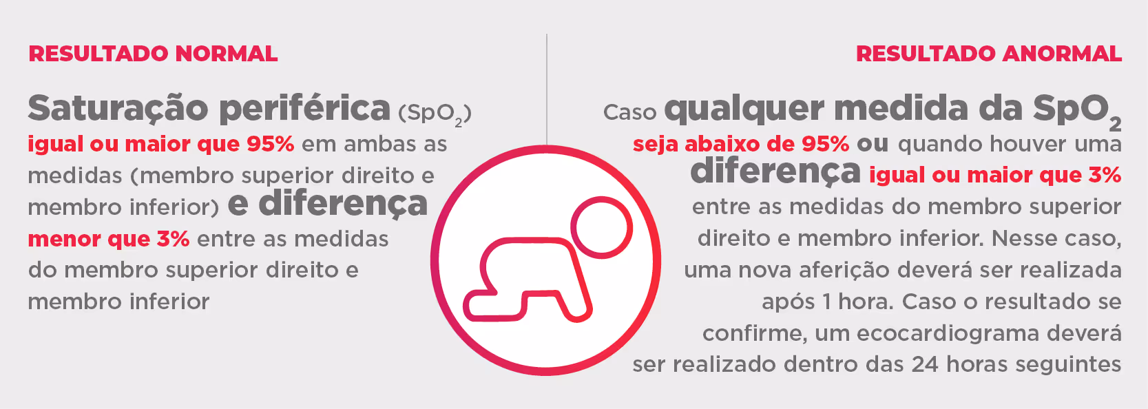 Para o Ministério da Saúde, na sua última cartilha de novembro de 2021, o “teste do coraçãozinho” deve ser submetido em todo recém-nascido aparentemente saudável com idade gestacional acima de 34 semanas, antes da alta na maternidade, entre 24 e 48 horas de vida (isso porque, no primeiro dia de vida, algumas alterações no organismo do recém-nascido podem atrapalhar o resultado) e deve ser com sensor adequado para uso no recém-nascido.