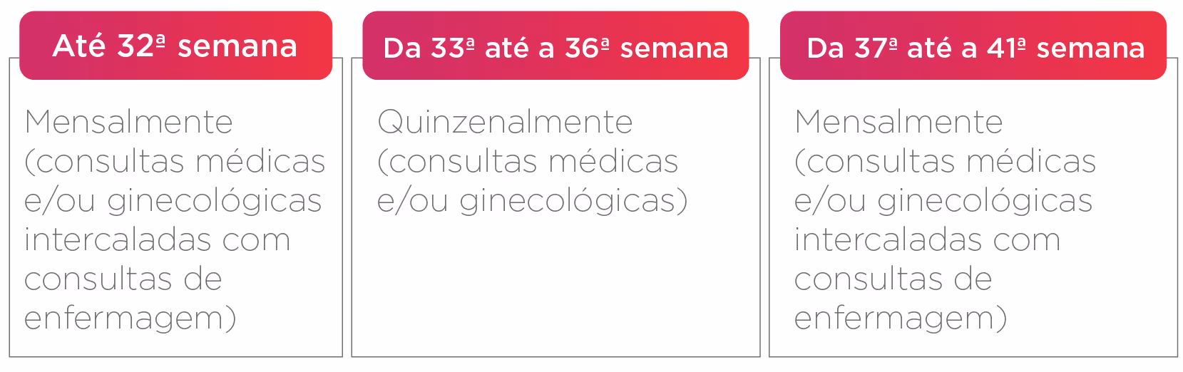 O Ministério da Saúde preconiza, o mínimo, de seis consultas de pré-natal, sendo uma consulta no primeiro trimestre, duas consultas no segundo trimestre e três consultas no terceiro trimestre. Todas as consultas de pré-natal devem ser registradas no Cartão da Gestante e no prontuário eletrônico do cidadão (PEC). E, abra o olho, as consultas devem ser realizadas conforme o seguinte cronograma: