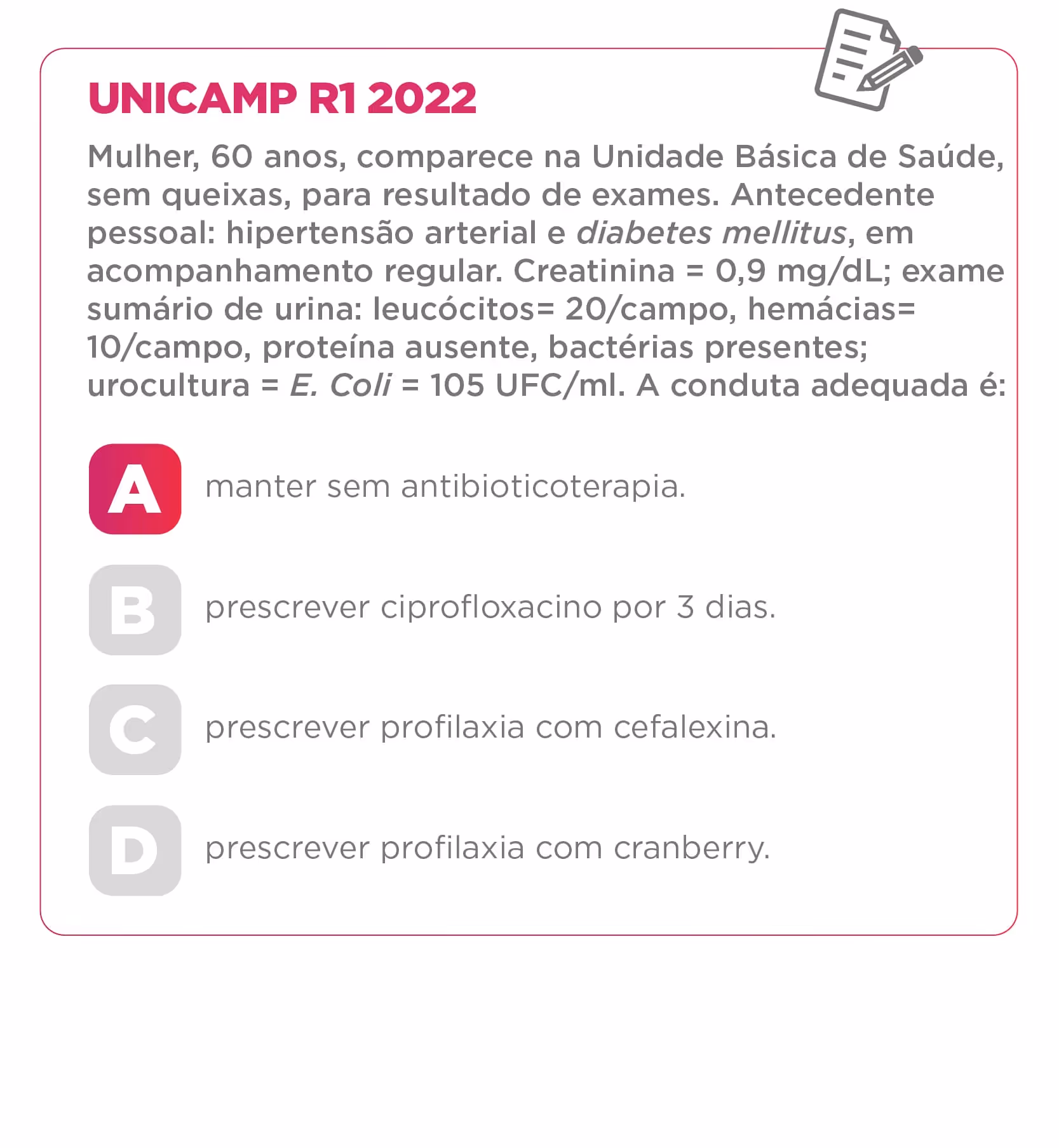 Questões de Múltipla Escolha com Casos Clínicos: Muitas provas teóricas de residência incluem questões de múltipla escolha que são baseadas em casos clínicos. Os candidatos devem ler a descrição do caso e escolher a resposta mais apropriada entre as opções fornecidas.