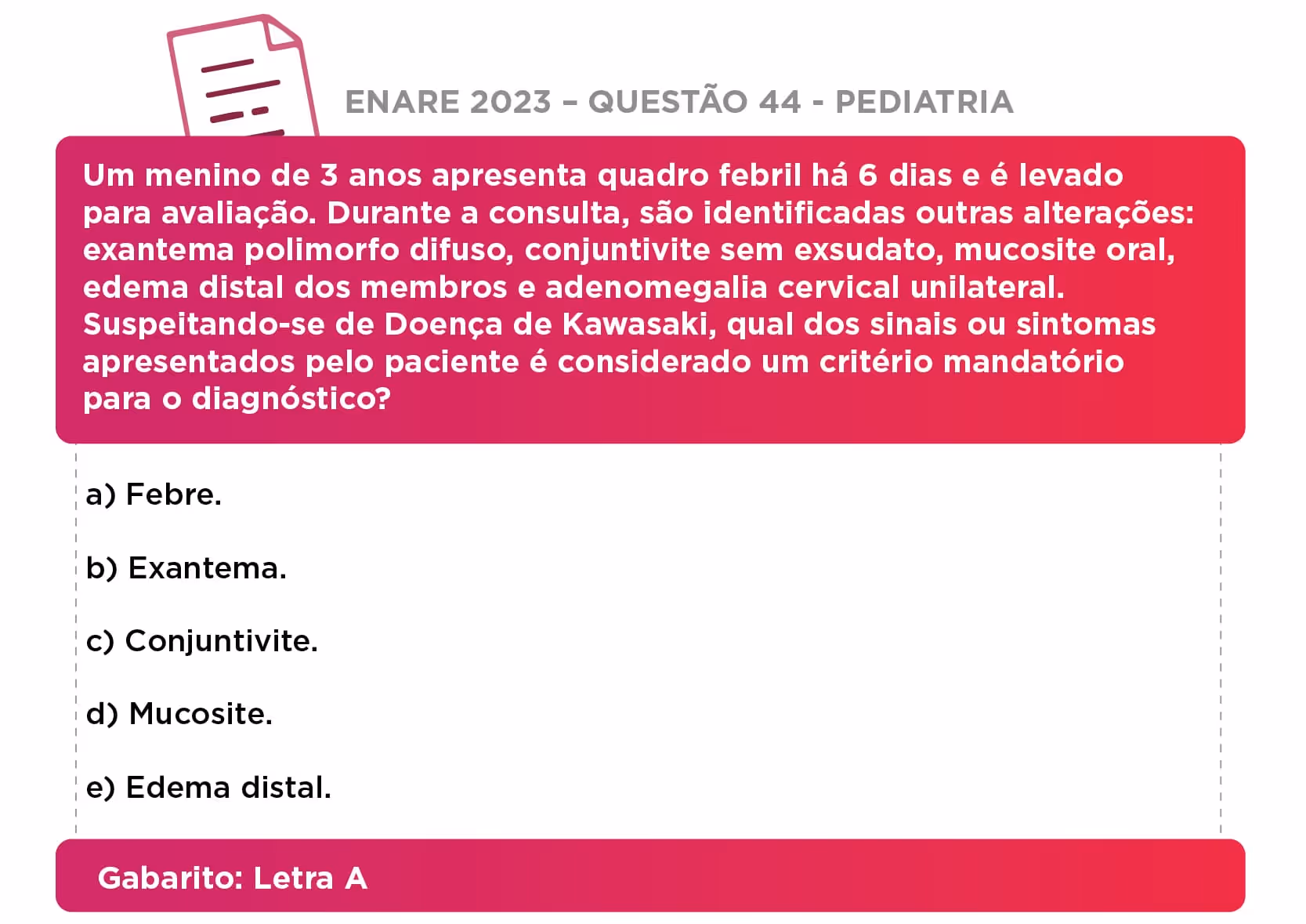 Questão sobre a doença de Kawasaki, uma doença exantemática cuja suspeita deve ser sempre levantada na presença de exantema em um paciente com febre há pelo menos 5 dias – sendo critério obrigatório para fechar o diagnóstico.