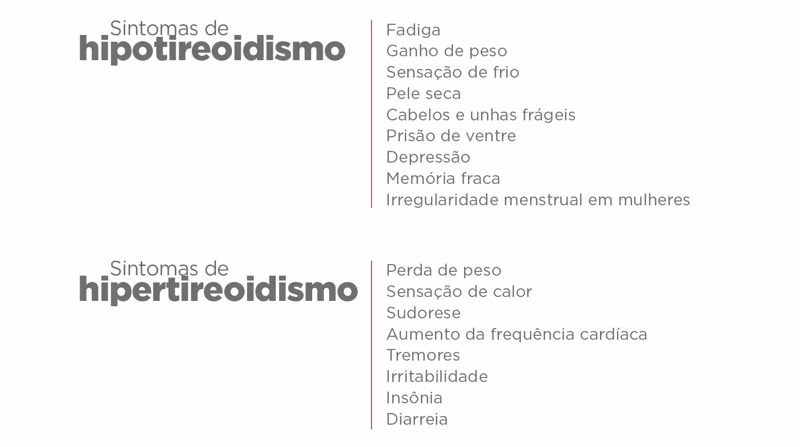 Os casos de hipotireoidismo são muito mais comuns do que o hipertireoidismo. A falta de hormônios da tireoide pode afetar a função de muitos órgãos diferentes no corpo, resultando em uma ampla variedade de sintomas. Por outro lado, o hipertireoidismo é uma condição em que a glândula tireoide produz hormônios em excesso. Isso pode acelerar a taxa metabólica do corpo. Veja os principais sintomas de ambos os casos: