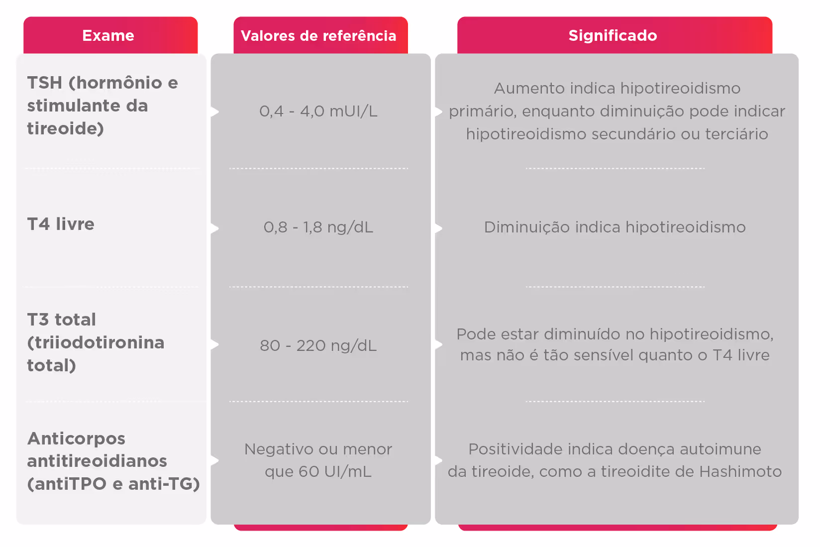 Separamos um Quadro que apresenta os testes laboratoriais mais comuns usados para diagnosticar o hipotireoidismo: