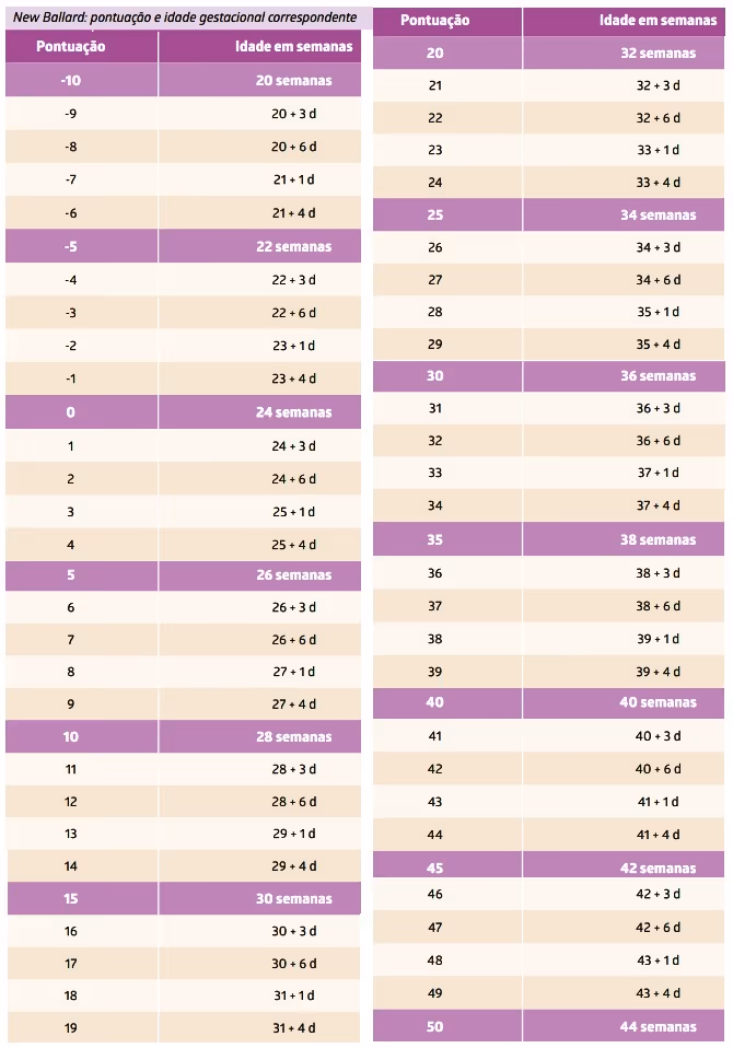Nesse método, o resultado é obtido com a soma simples da pontuação correspondente a todos os parâmetros avaliados. No quadro a seguir, nós correlacionamos a idade gestacional (semanas e dias) à somatória encontrada.