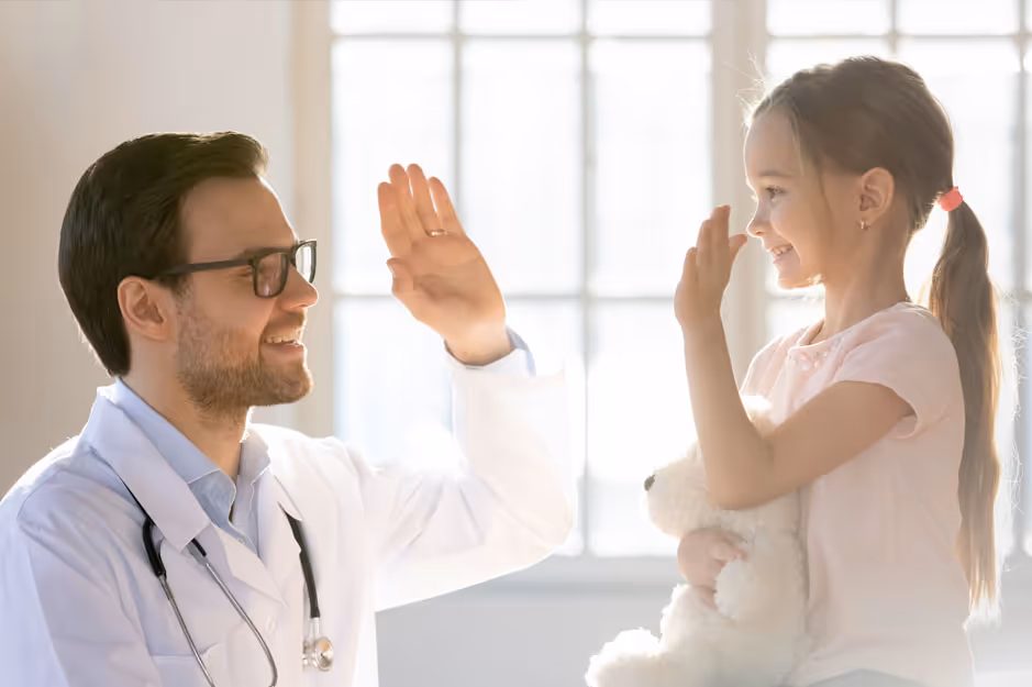 Shutterstock. Fizkes: https://www.shutterstock.com/pt/image-photo/friendly-male-pediatrician-giving-high-five-1783990037