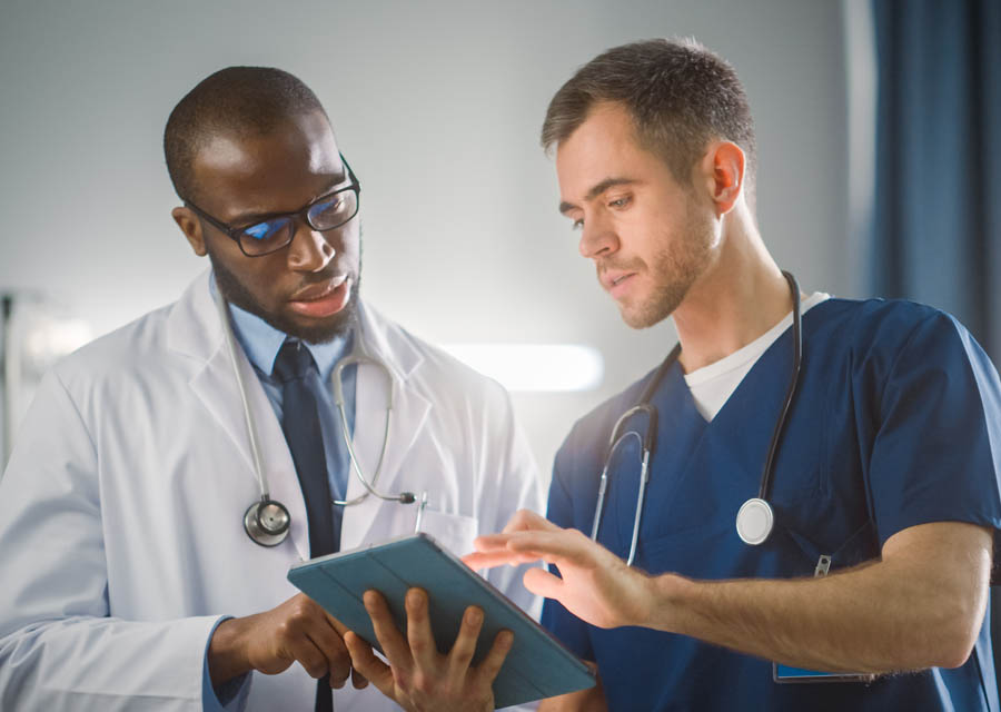 Shutterstock. Gorodenkoff. https://www.shutterstock.com/pt/image-photo/hospital-ward-black-doctor-talks-professional-1940771092