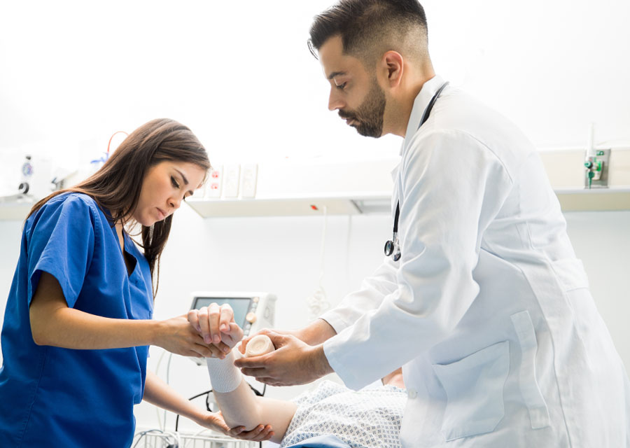 Shutterstock. Antonidiaz. https://www.shutterstock.com/pt/image-photo/good-looking-doctors-putting-bandage-on-533672692